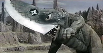 Guiron acted as the guard dog of two brain-eating space women, the last of a dead civilization on the planet Terra. The aliens guided him with a mind control device. Guiron proved his combat prowess by effortlessly defeating a Space Gyaos, reflecting its sonic cutter beam and literally slicing it to pieces with his blade. Guiron later fought Gamera, and nearly killed him as well. After a long fight, Gamera eventually managed to defeat the knife headed beast by flipping him upside down - his blade stuck in the earth - then igniting a missile that had gotten stuck in his circular indents, blowing his head off and killing him.
